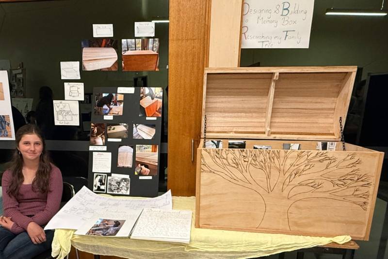 Grace, moved by the loss of her two grandfathers and inspired by Little Women, created a memory chest. She built a prototype first to practise her skills, then her final piece, a handcrafted wooden chest engraved with a tree and phases of the moon. She also researched her family history and compiled a family tree, weaving together personal reflection, craft, and history.