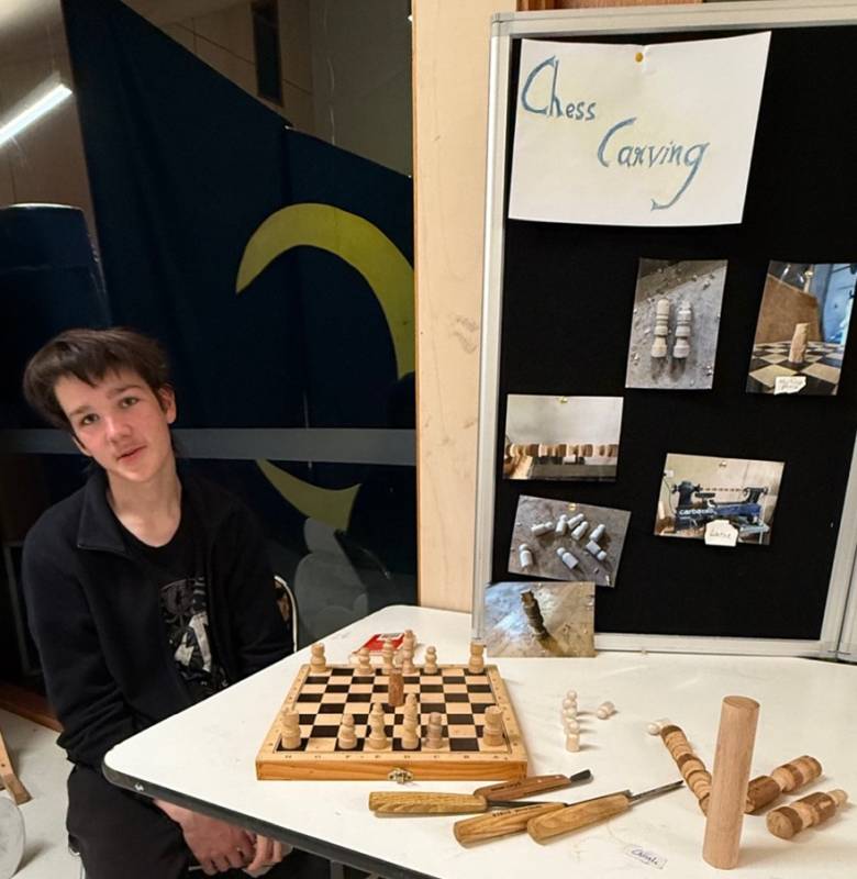 Ethan undertook the painstaking task of carving a chess set by hand. Each piece was turned on a lathe and then refined with carving knives. He described spending three hours carefully cutting the cross on the king, only to have it break — a setback he faced with resilience. Though the process has been far more time-consuming than expected, he is committed to completing the set and crafting a chessboard from special woods.